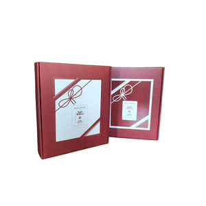 Die Box wird bereits verpackt (Farbe Bordeaux) mit Farbiges Band, Grußkarte und Broschüren.